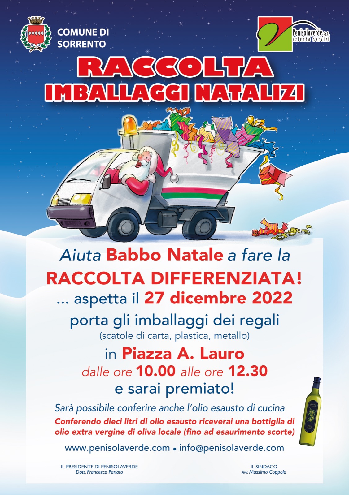 Il 27 dicembre, dalle ore 10 alle 12.30, in piazza Angelina Lauro, a Sorrento, sarà possibile conferire gli imballaggi dei regali di Natale. Scatole di carta, plastica e metallo saranno ritirate da personale di Penisolaverde, che assisterà i cittadini anche per la raccolta di olio esausto da cucina.