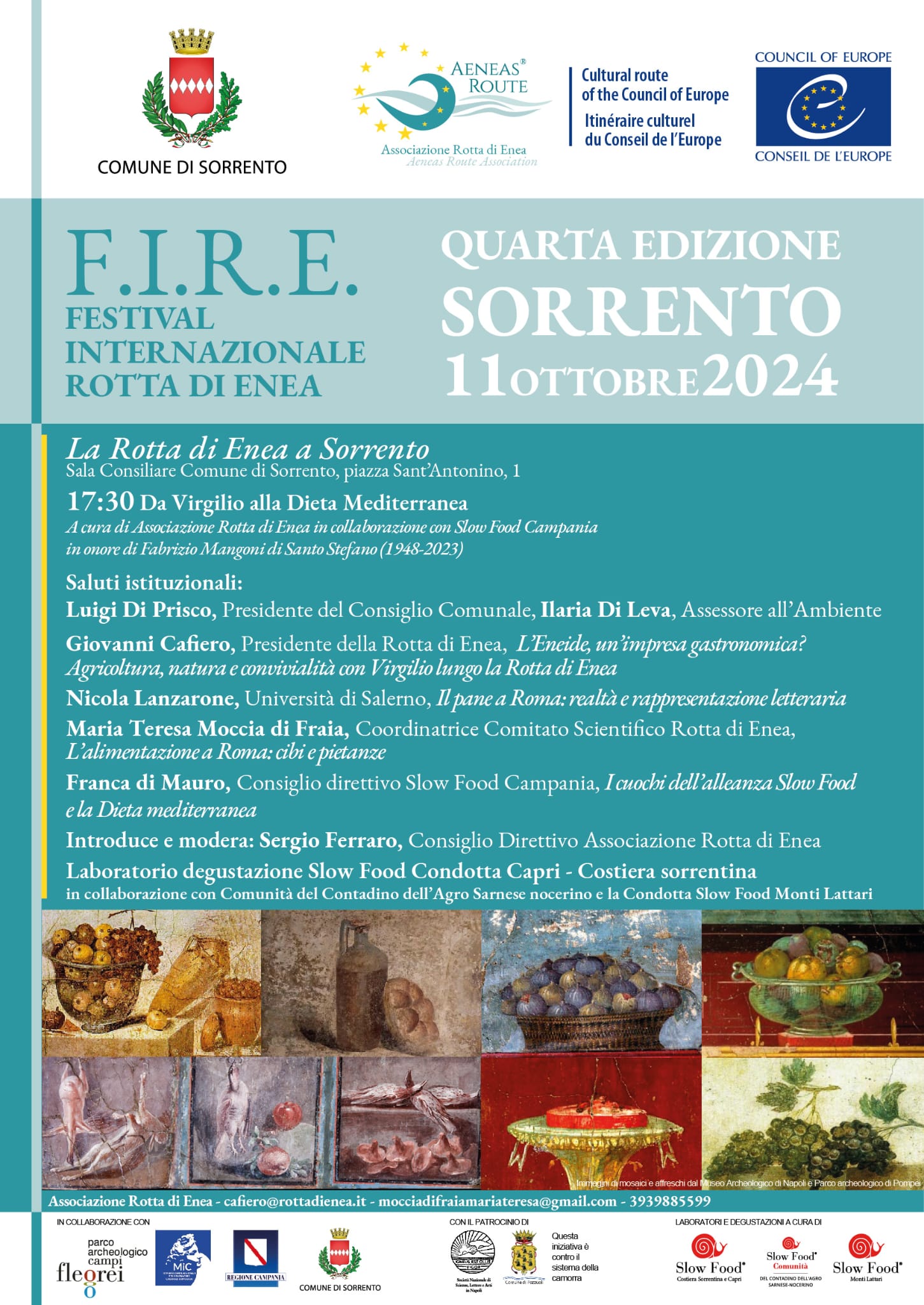Un omaggio alla memoria di Fabrizio Mangoni, l'architetto e gastronomo scomparso lo scorso anno, che si aprirà con i saluti di Luigi Di Prisco, presidente del consiglio comunale, Ilaria Di Leva, assessore all'Ambiente, Giovanni Cafiero, presidente della Rotta di Enea, Nicola Lanzarone, dell'Università di Salerno, Maria Teresa Moccia di Fraia, coordinatrice del comitato scientifico Rotta di Enea, Franca di Mauro, del consiglio direttivo Slow Food Campania, moderati da Sergio Ferraro, del consiglio direttivo dell'associazione Rotta di Enea.