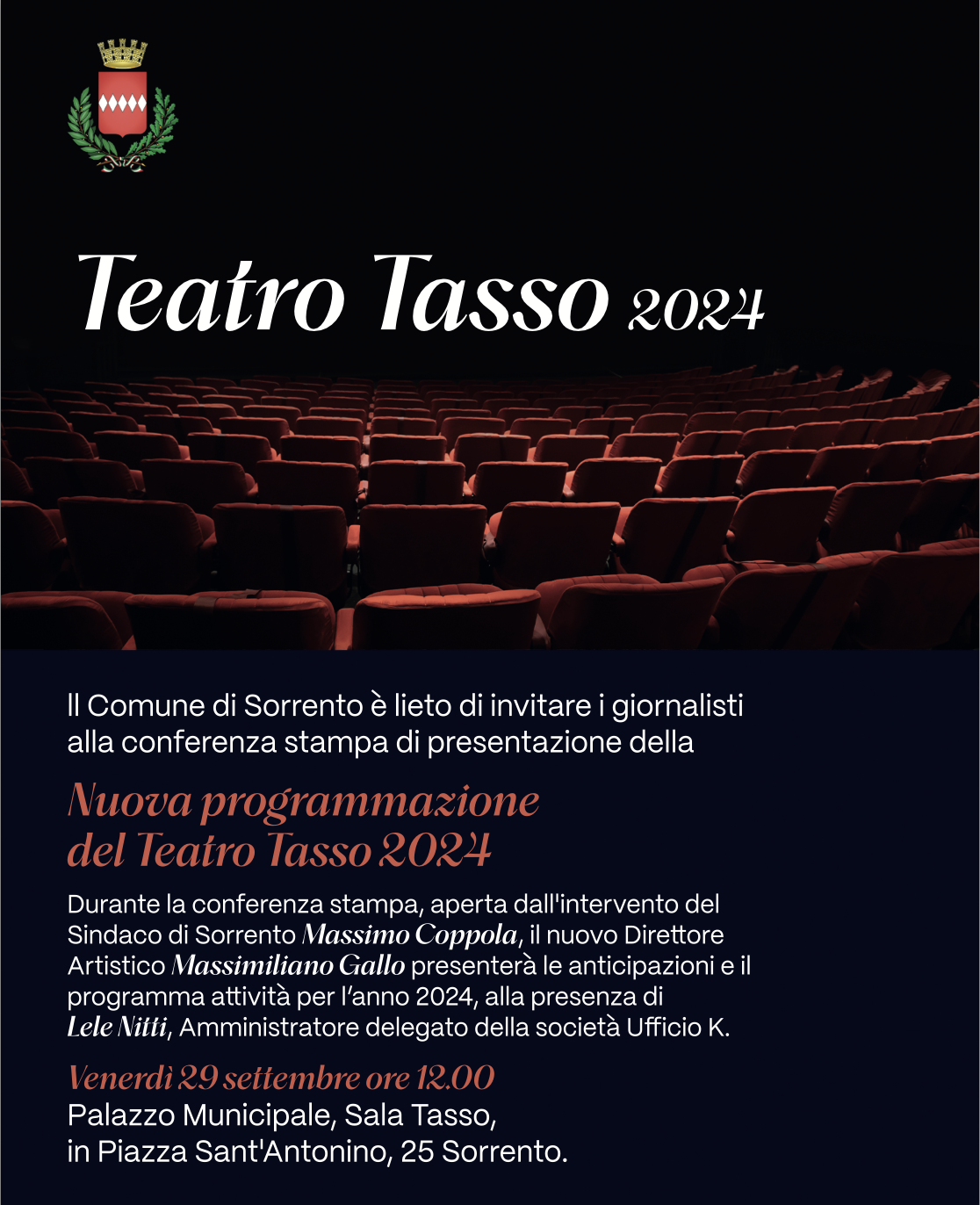 All'incontro prederanno parte il sindaco di Sorrento, Massimo Coppola, il nuovo direttore artistico del Teatro Tasso, Massimiliano Gallo, che presenterà le anticipazioni e le attività per l’anno 2024, e l'amministratore delegato della società Ufficio K, Lele Nitti.