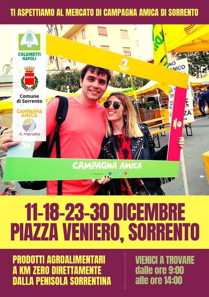 Domani 18 dicembre (e a seguire il 23 ed il 30 dicembre) a Sorrento, in piazza Andrea Veniero, dalle ore 9 alle 14, torna il "Mercatino del territorio e della tradizione, l'iniziativa promossa dal Comune di Sorrento e da Coldiretti Campania per promuovere e valorizzare le produzioni locali.
