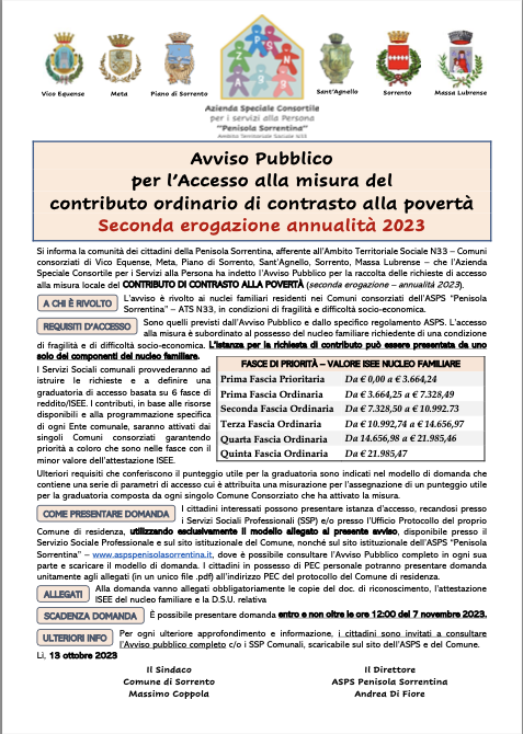 Sorrento. Avviso pubblico per il contributo ordinario di contrasto alla povertà, seconda annualità 2023