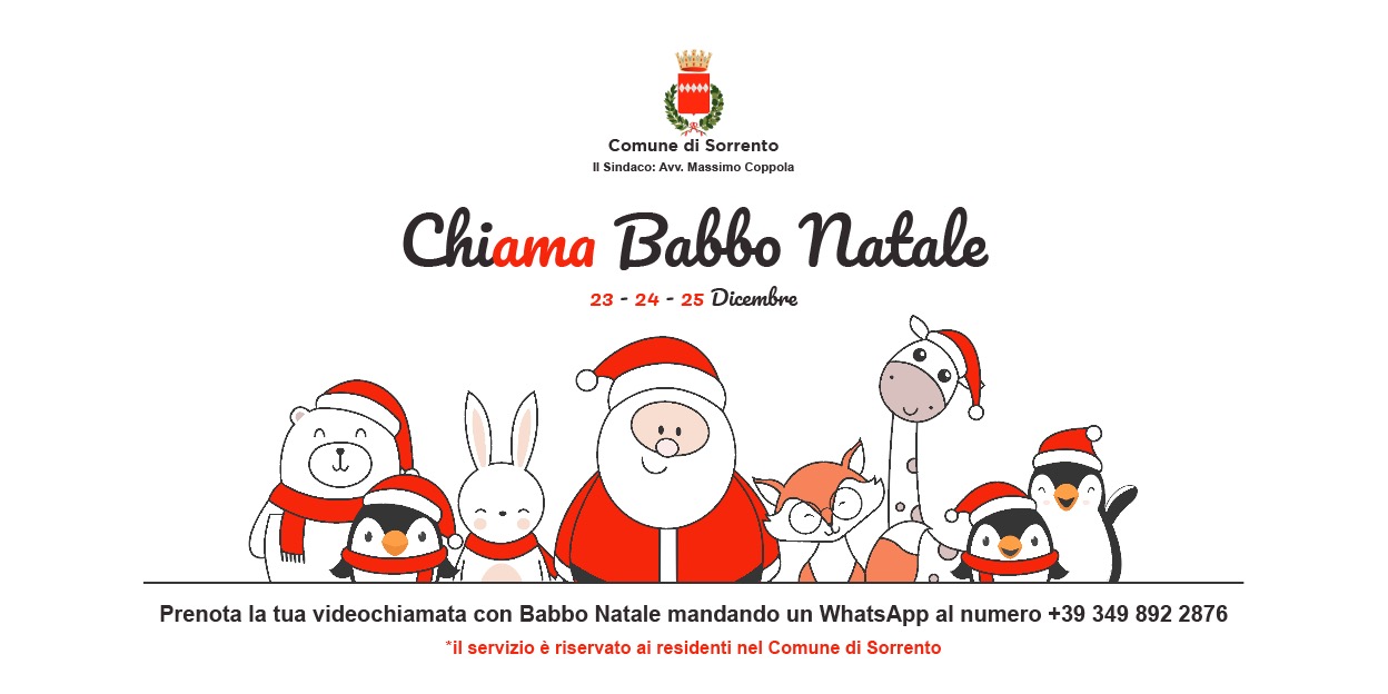 Esprimere direttamente a Babbo Natale, attraverso una videochiamata, i propri desideri, e leggergli la lista dei regali. L'iniziativa, denominata Chiama Babbo Natale, è promossa dall'amministrazione comunale di Sorrento e sarà attiva nei giorni 23, 24 e 25 dicembre. Utilizzando la popolare applicazione di messaggistica WhatsApp, sarà possibile inviare un messaggio al numero 3498922876 indicando semplicemente nome e cognome. Gli operatori prenderanno in carico la richiesta, comunicando successivamente giorno e ora in cui Babbo Natale li contatterà con una videochiamata.