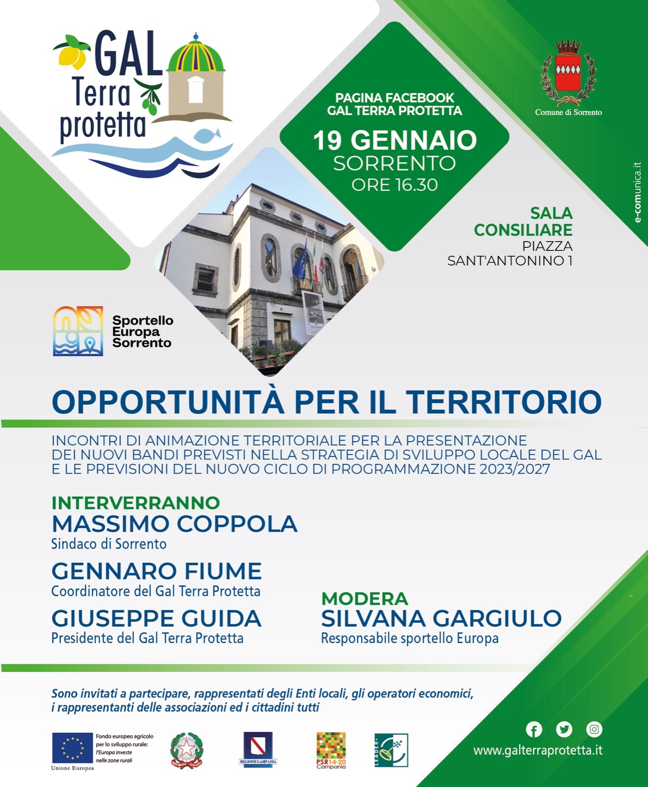 Giovedì 19 gennaio, alle ore 16.30, presso la sala Tasso del Palazzo Municipale di Sorrento, si terrà un incontro dal titolo "Opportunità per il territorio", finalizzato a presentare i nuovi bandi previsti nella strategia di sviluppo locale dei Gal.