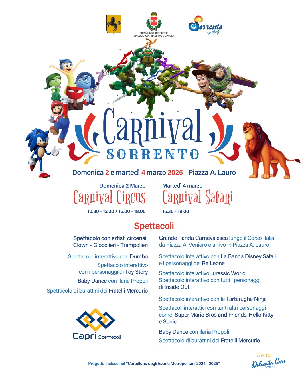 Organizzate dal Comune di Sorrento, le iniziative prevedono spettacoli di giocolieri, trampolieri, maghi e artisti di strada e parate con personaggi animati.