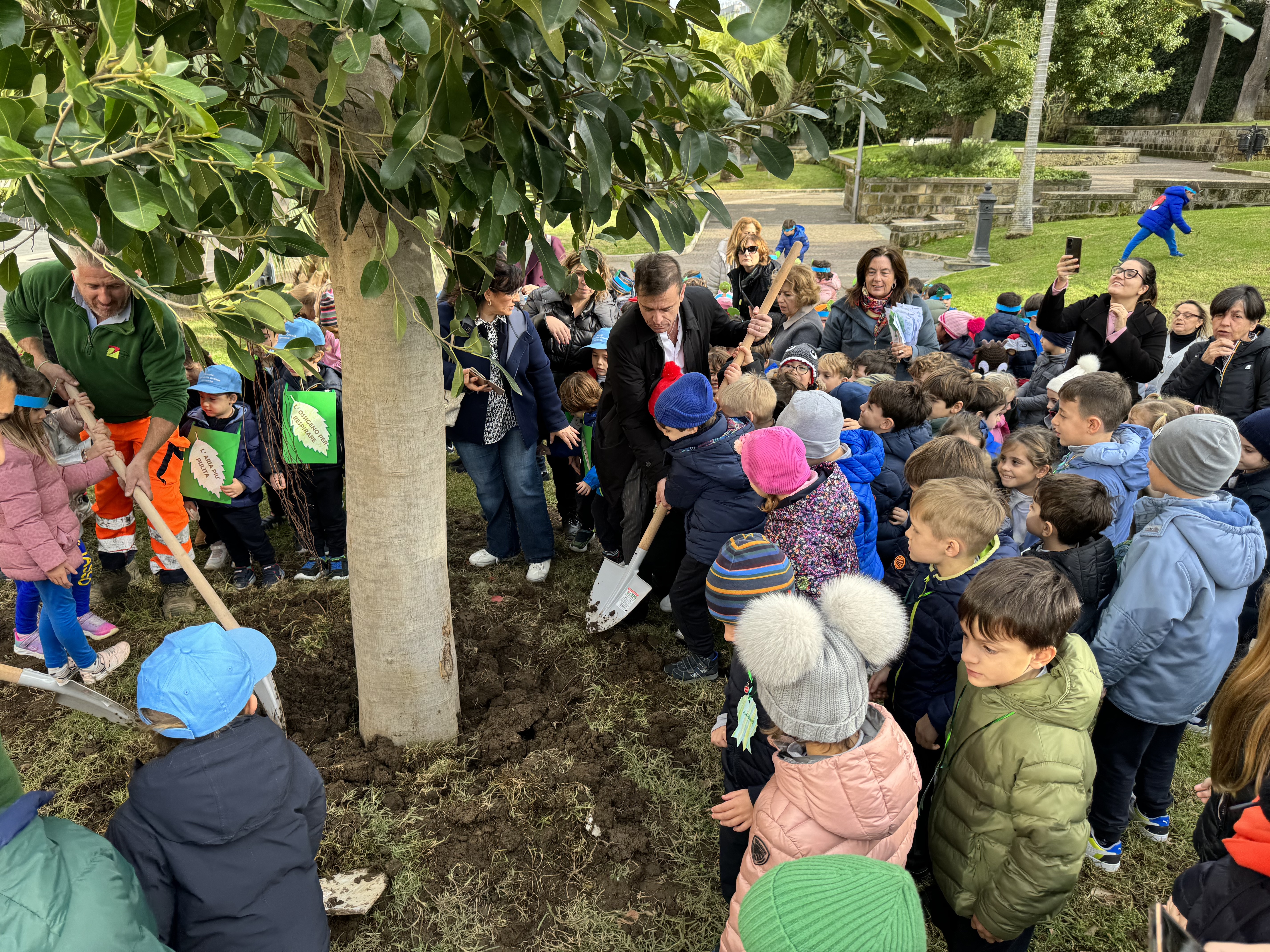 Attorniato dai bambini, il sindaco Coppola ha dato il via alla piantumazione mentre Luigi Cuomo, direttore di Penisolaverde, ha illustrato ai piccoli studenti l'importanza degli alberi per il pianeta.