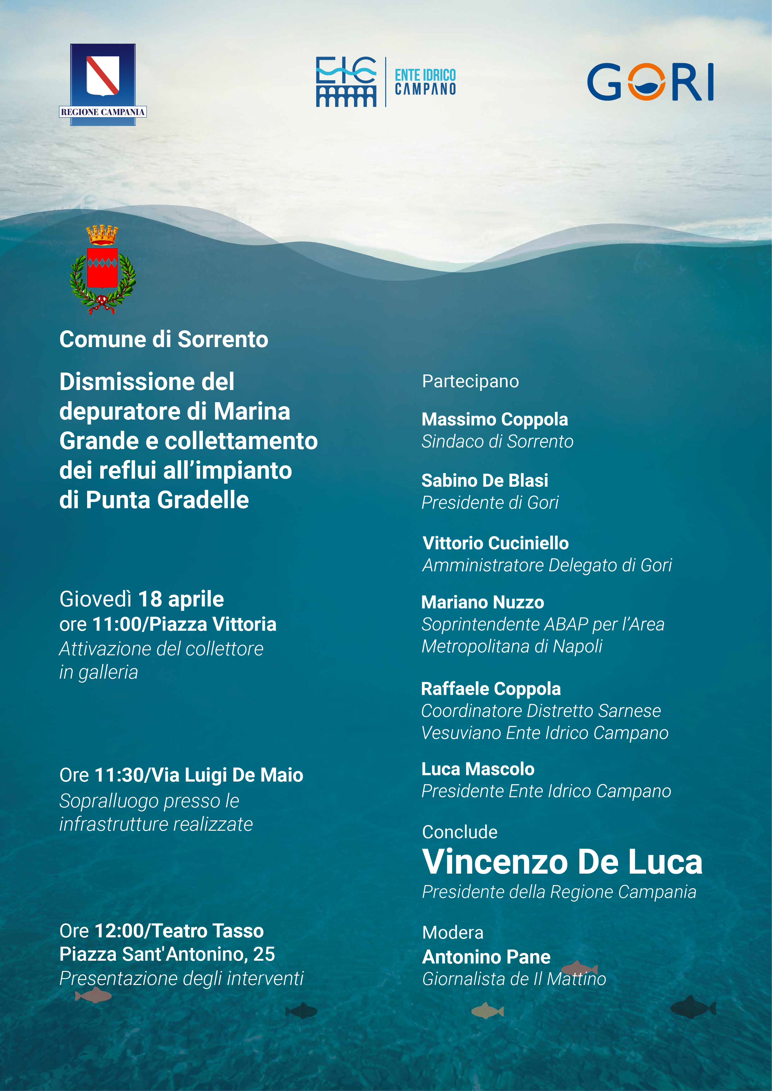 Partecipano il sindaco, Massimo Coppola, il presidente e l'amministratore delegato di Gori, Sabino De Blasi e Vittorio Cuciniello, il soprintendente Archeologia, Belle Arti e Paesaggio per l’Area Metropolitana di Napoli, Mariano Nuzzo, il coordinatore del distretto sarnese vesuviano dell'Ente idrico campano, Raffaele Coppola e il presidente dell'Ente idrico campano, Luca Mascolo, moderati dal giornalista Antonino Pane. Le conclusioni sono affidate al presidente della Regione Campania, Vincenzo De Luca.