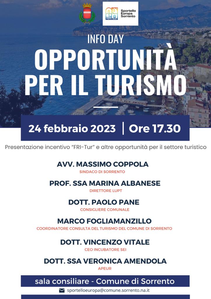 Venerdì 24 febbraio, alle ore 17.30 presso la sala consiliare del Comune di Sorrento si terrà l'evento “Info day, opportunità per il turismo” per presentare l’incentivo FRI-Tur, il Fondo rotativo imprese per il sostegno alle imprese e agli investimenti di sviluppo nel turismo.