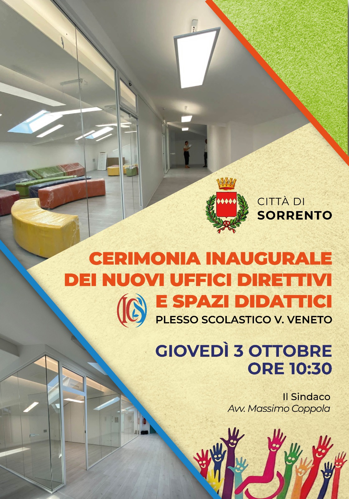 Il sindaco di Sorrento, Massimo Coppola, inaugurerà giovedì 3 ottobre, alle ore 10.30, una nuova area di oltre 600 metri quadrati, presso il plesso della Vittorio Veneto, ricavata grazie al recupero del sottotetto e alla realizzazione dell’ascensore di collegamento. I nuovi spazi ospiteranno una biblioteca, laboratori, aule docenti ed uffici al servizio dell'istituto comprensivo Sorrento.