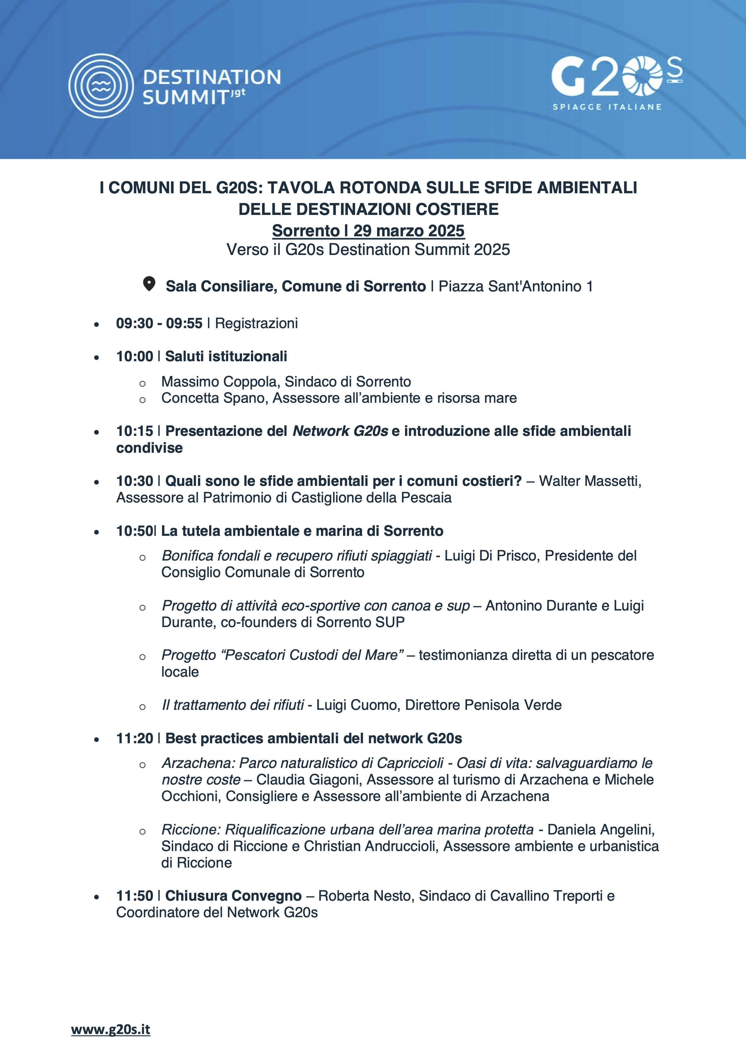 Previsti gli interventi di Walter Cassetti, assessore al Patrimonio di Castiglione della Pescaia, seguito da un panel su "La tutela ambientale e marina a Sorrento", coordinato dal presidente del consiglio comunale di Sorrento, Luigi Di Prisco, al quale prenderanno parte Luigi Cuomo, direttore di Penisolaverde, Antonino Durante e Luigi Durante, fondatori di Sorrento Sup. Nell'occasione sarà illustrata l'iniziativa promossa dal Comune di Sorrento e da Penisolaverde per la raccolta e il monitoraggio dei rifiuti accidentalmente raccolti in mare dalle imbarcazioni durante le attività di pesca, con la testimonianza di alcuni pescatori. Best practise ambientali saranno anche al centro degli interventi di Claudia Giacconi, assessore al Turismo di Arzachena, di Michele Occhioni, assessore all'ambiente di Arzachena, di Daniela Angelini, sindaco di Riccione e di Christian Andruiccioli, assessore all'Ambiente e all'Urbanistica di Riccione. Le conclusioni saranno affidate a Roberta Nesto, coordinatore del G20Spiagge e sindaco o di Cavallino Treporti.