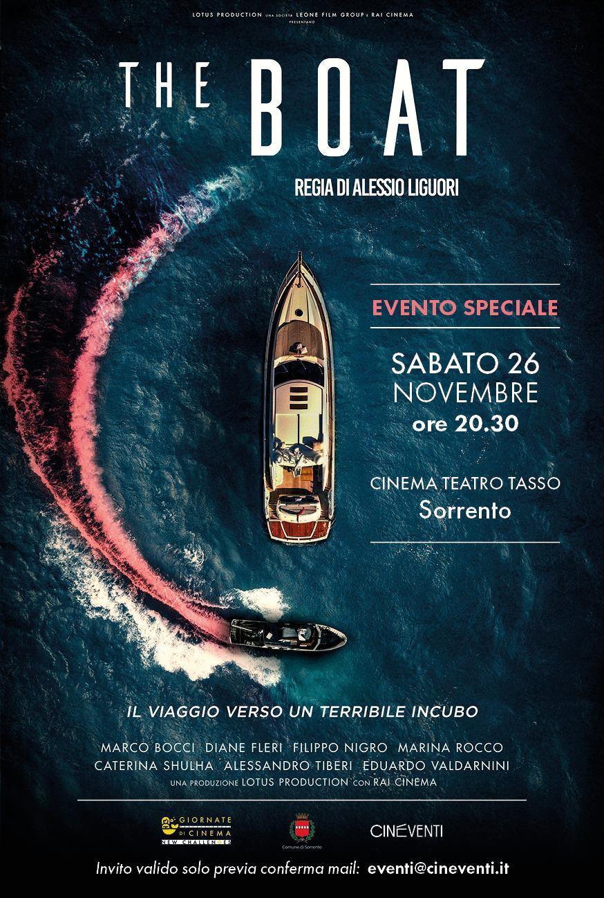 Alle ore 20.30 presso il teatro comunale Tasso, seguirà la proiezione di The Boat un thriller prodotto da Lotus Production con Rai Cinema, girato lo scorso anno in varie location della penisola sorrentina, che apre ufficialmente la programmazione degli eventi aperti alla città della 45ma edizione delle Giornate Professionali di Cinema. La partecipazione all’evento è gratuita previa registrazione tramite il link https://www.eventbrite.it/e/biglietti-the-boat-evento-speciale-472459598377 o ritirando i biglietti, da domani, presso l’info point di piazza Tasso, dove sono disponibili anche programma ed inviti per l'ingresso alle varie proiezioni delle Giornate aperte al pubblico.