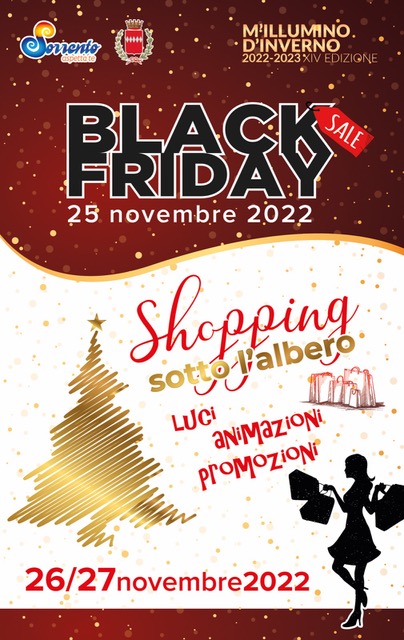 Accensione delle luminarie, anteprime gratuite al cinema e shopping nei negozi a prezzi scontati. Un fine settimana denso di appuntamenti, quello che attende cittadini e visitatori, organizzato dal Comune di Sorrento ed inserito nel cartellone della rassegna M’Illumino d’inverno. Si parte venerdì 25 con il Black Friday, che darà l'opportunità a cittadini e visitatori di usufruire di agevolazioni e promozioni nei negozi che aderiscono all'iniziativa e che proseguiranno nei due giorni successivi con "Shopping sotto l'albero".