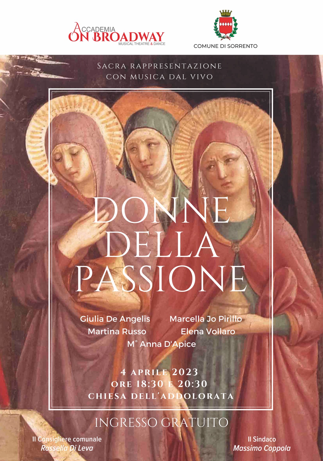 "Donne della Passione" è il titolo dello spettacolo in programma domani, 4 aprile, alle ore 18.30 e alle ore 20.30, presso la chiesa dell'Addolorata di Sorrento, e patrocinato dal Comune di Sorrento.