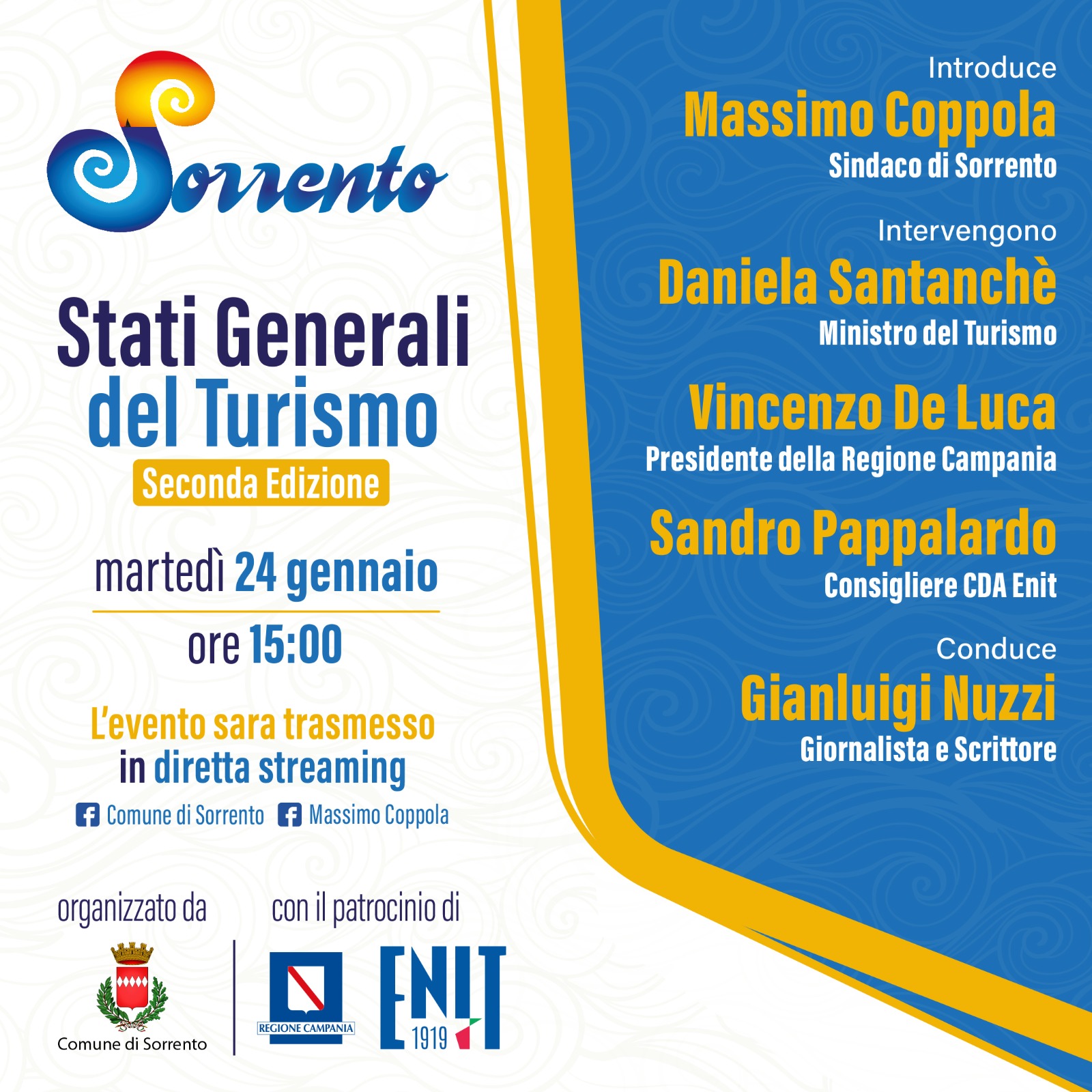 Martedì 24 gennaio, alle ore 15, a Sorrento apriranno i lavori della seconda edizione degli Stati Generali del Turismo, promossi dal Comune di Sorrento, con il patrocinio della Regione Campania e di Enit. Sarà l’occasione per fare il punto sul settore in vista della stagione estiva, analizzando dati e valutando possibili scenari futuri.