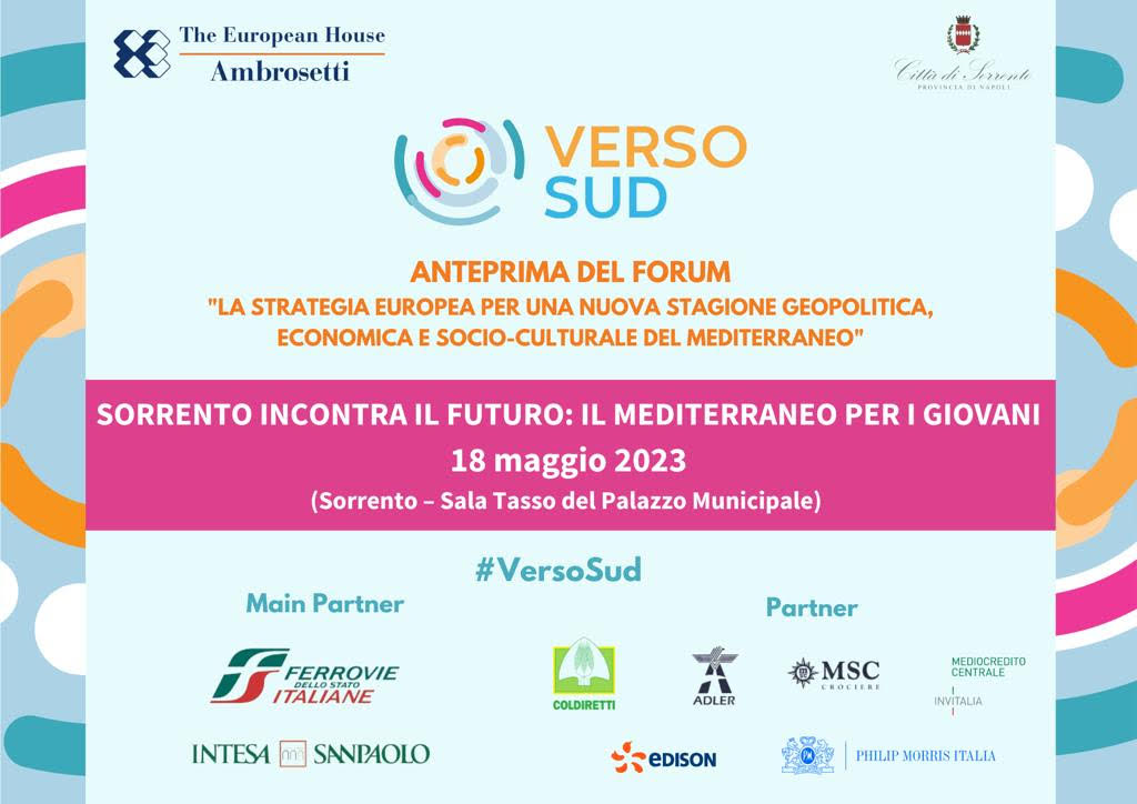 Giovedì 18 maggio, a partire dalle ore 15.30 presso la Sala Consiliare del Comune di Sorrento si terrà l’evento di anteprima del Forum “Verso Sud - La strategia europea per una nuova stagione geopolitica, economica e socio-culturale del Mediterraneo”.